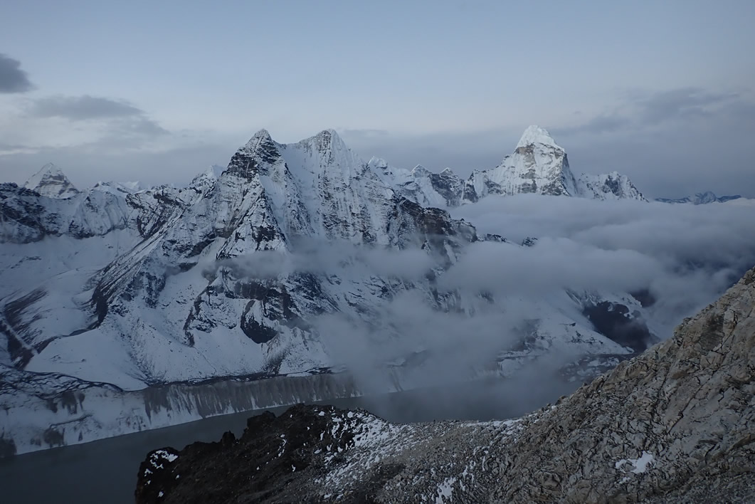 Las vistas son excepcionales, entre todas las montañas y paisaje que podemos observar desde esta ladera este, sureste del Island Peak, Imja Tse, las más impresionantes y cercanas o destacables, es ante todo el Ama Dablam ¡Precioso! Es una aguja gigante, gigante, con caras como un prisma, como una piedra preciosa, pero aún queda algo al fondo, delante tenemos el fabuloso muro del Numri, Kali Himal, Baruntse, Amphu I, Amphu Labsta… incluso detrás de este extraordinario muro de entre seis mil seiscientos y siete mil metros, aparece la punta del Peak 41, una mole en forma de pirámide apuntada, escarpada y elegante, que a pesar de su nombre, es una montaña que bien se merece un nombre extraordinario, tal y como es. Fabuloso.