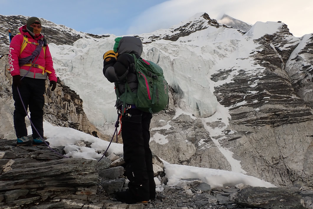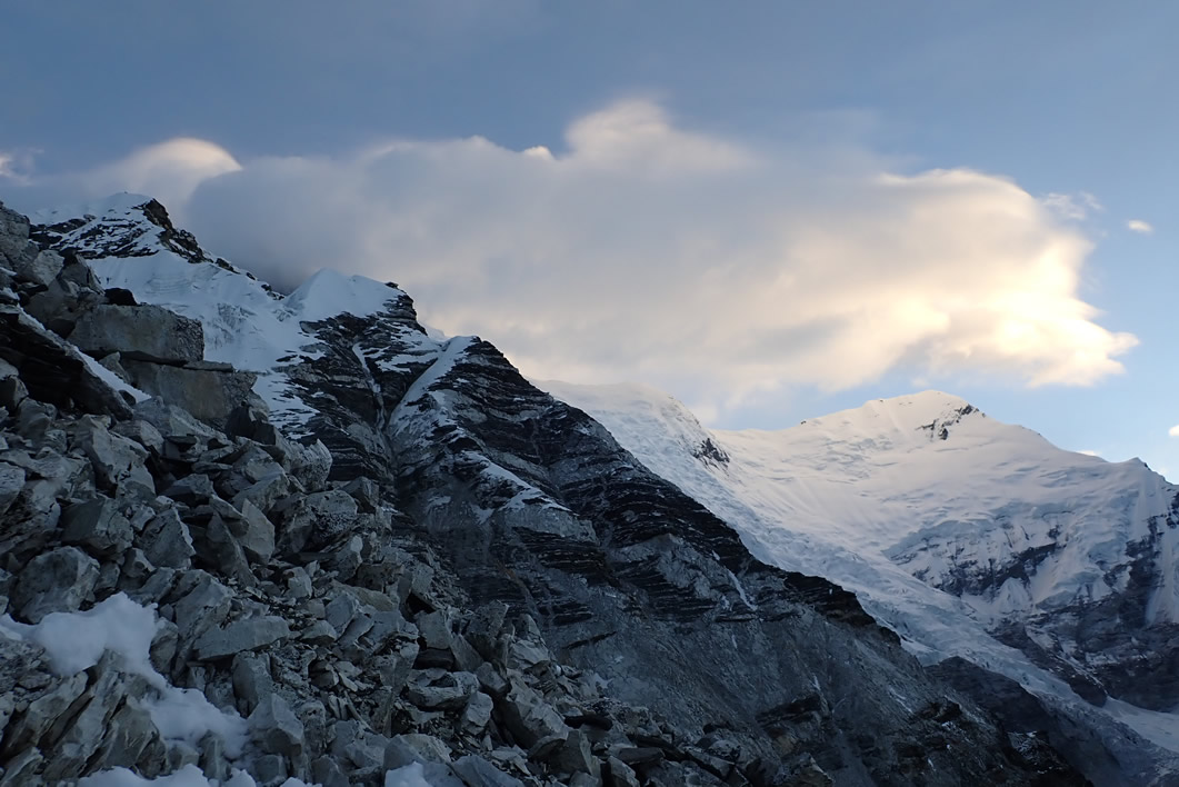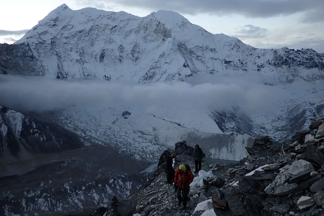 Aún no hemos llegado al glaciar este del Island Peak, un pequeño glaciar (si lo comparas con el resto) cimero del pico. Seguimos la senda con la luz del amanecer y ya nos vemos sin los frontales encendidos; y a pesar de las piedras y las rocas sueltas o roca madre de la montaña, comienza a aparecer la nieve por los rincones junto a la senda. Poco más arriba descubrimos que la chica rubia del grupo francés se baja con uno de los guías, igual le ha dado el mal de altura, subían más rápido que nosotros.