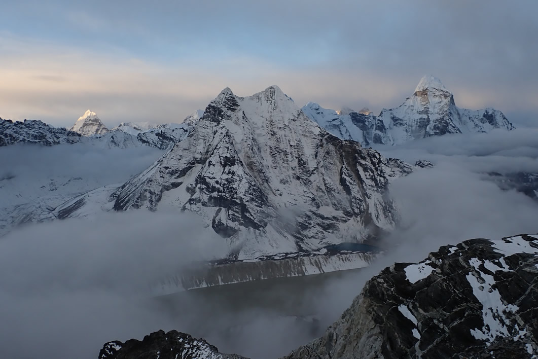 Abajo el lago Imja Tsho, arriba delante las puntas de la zona del Amphu Labsta, el Ama Dablam (6.814 mts.) a la derecha, y amaneciendo en el posiblemente Peak 41 (6.648 mts.) al fondo izquierda,