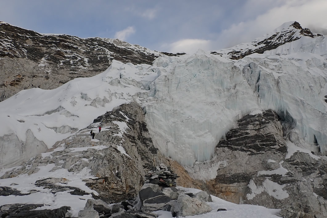 Punto donde entramos al glaciar de la parte este del Island Peak, arriba la (nueva) barrera rocosa que te sube a la cresta cimera