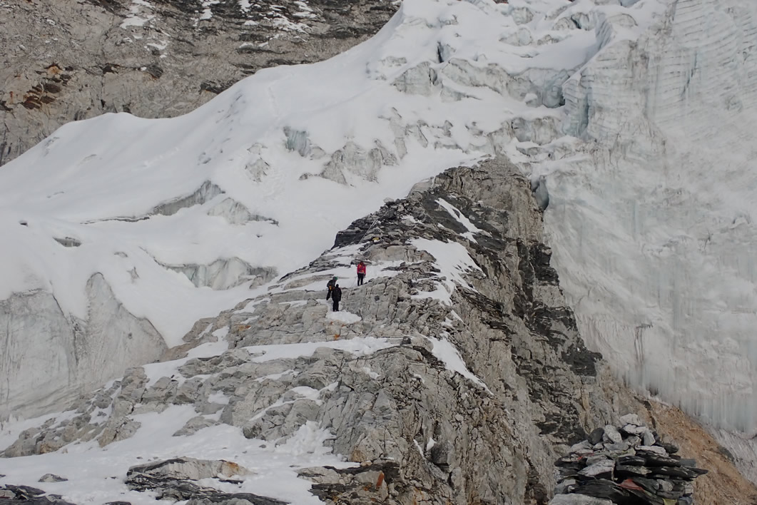El cansancio cada vez es más fuerte y se agudiza en mí, pero no pienso en retirarme ni en parar. El nuevo guía encuerda a Dolors, supongo porque ya comenzábamos a caminar entre roca viva algo más escarpada sin senda y con algo de caída, nada peligroso. Dicho camino nos lleva por una especie de crestecilla, y gran loma rocosa hasta un rincón de roca rodeado del glaciar de la cima del Island Peak. No lo sabía en ese momento pero ya debíamos estar sobre o cerca de los cinco mil ochocientos cincuenta metros de altura. Llego el último al rincón rocoso. A partir de aquí toca ascender por el glaciar. Estoy notablemente cansado, pero mis compañeros no lo notan. A penas hemos comido o bebido algo en el ascenso, he pasado calor con el plumas y debo de haberme deshidratado… aún lo llevo puesto pero abierto; y con el mal cuerpo de haber comido en el desayuno temprano sin tener hambre. La luz del día ya nos da de lleno. Al llegar observamos como un grupo ya baja por el glaciar, ya van de retirada. No sé si han hecho cumbre pero eso me anima, prefiero pensar que sí y que ha sido fácil.