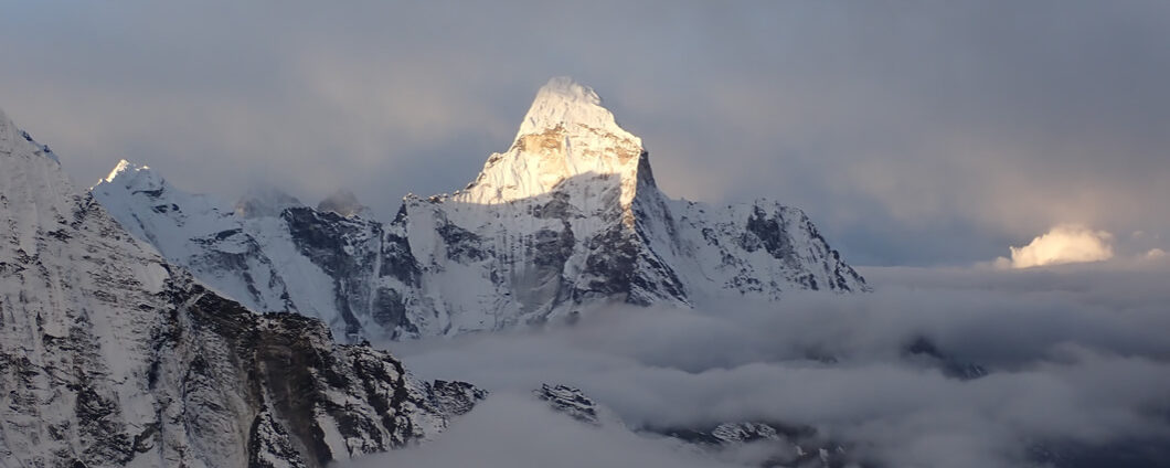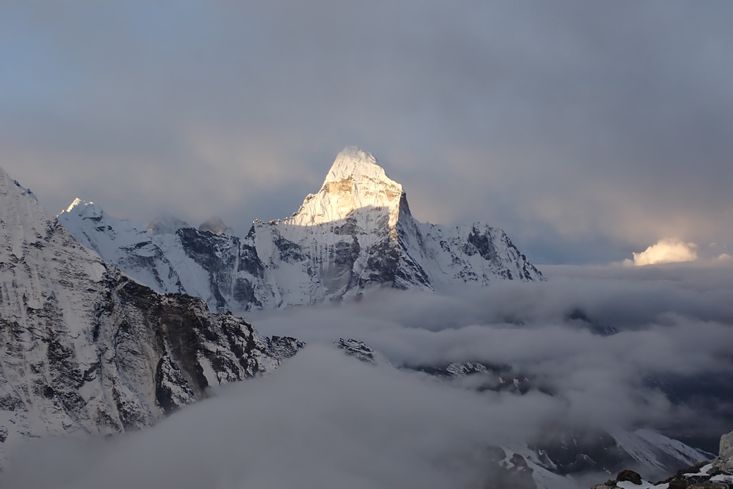 Mirando hacia arriba y girando la vista un poco hacia la derecha, descubrimos el glaciar como baja de la cima de la montaña, y más arriba, una de la puntas del glaciar, la cima de la misma… ¡Vamos, que la tenemos ahí! En la parte que estamos es muy empinada y escarpada como para que se quede colgado, pegado el hielo, y poco más arriba la montaña es más suave como para crear o formar un plateau. El sol comienza a iluminar algunas montañas y nos regala una postal iluminando el Ama Dablam. Es precioso.