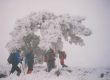 Descansamos en la rocosa cima del Alto de Las Cabras, un alto hito de piedra así lo atestigua; hoy día creo que hay un pilón o eje geodésico. Comemos algo, es cerca o mediodía, y para postres las sobras de los duces de Navidad; como marca mi tradición montañera, con lo que comparto una redonda torta de chocolate que hace las delicias y risas de mis amigos y compañeros de montañas. El tiempo se mantiene estable con nubes altas y neblinas en el horizonte; pero con el frío normal del invierno en la alta montaña continental mediterránea. La nieve se ha quedado oculta en los rincones sombríos del bosque y de la sierra, y aquí arriba, como en las zonas de solana, ya la ha fundido el incesante sol.